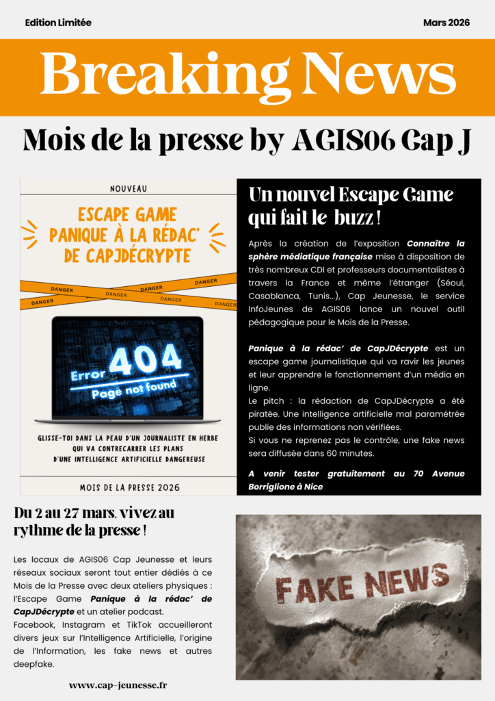 Et c’est parti pour une nouvelle édition de notre Mois de la Presse du 2 au 27 mars avec une grosse nouveauté : le lancement de notre Escape Game Panique à la rédac’ de CapJDécrypte à tester gratuitement dans nos locaux du 70 Avenue Borriglione. Rendez-vous le 24 mars à 10h.