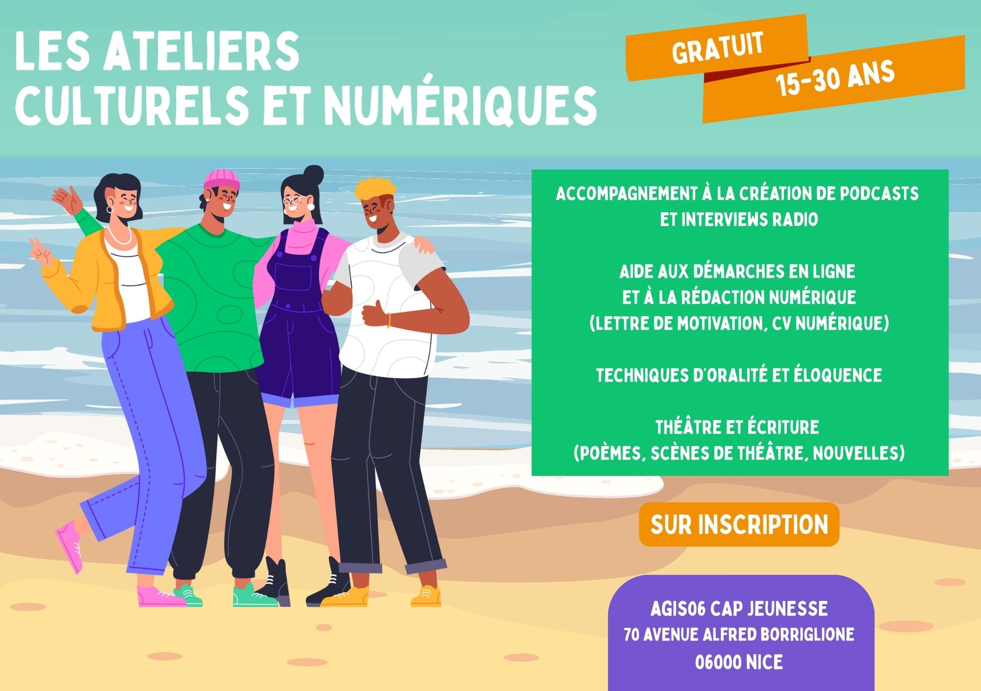 Tous les mois, AGIS06 Cap Jeunesse propose son planning des ateliers numériques et culturels sur les réseaux sociaux et dans la newsletter ! Ces ateliers sont 100 % gratuits, sous réserve de participation en présentiel à AGIS06 Cap Jeunesse (Nice).